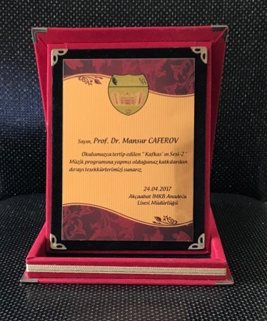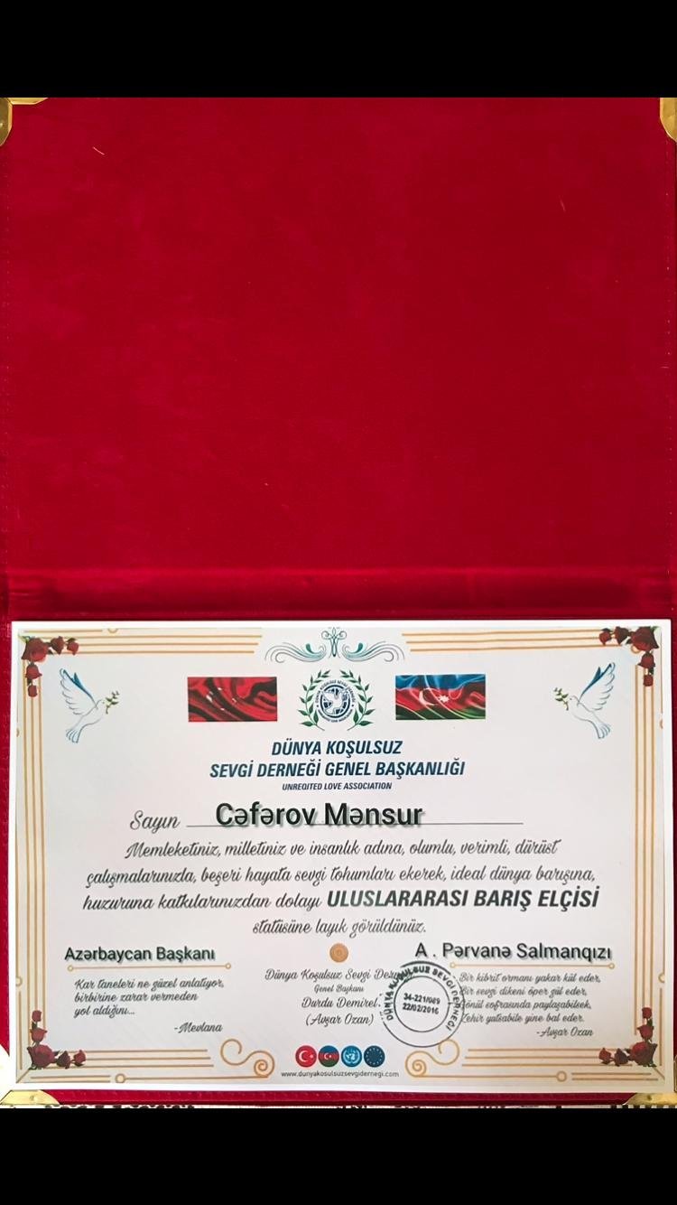 Təsadüfi deyil ki,onun əməyini Türkiyə dövləti yüksək qiymıtləndirərək müxtəlif diplom və adalara layiq görüb.Bu yaxında "ULUSLARARASI BARIŞ ELÇİSİ" mükafatına layiq görülüb.