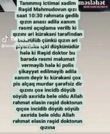 Tanınmış ictimai xadim, Azərbaycan Tibb Universitetinin dosenti Rəşid Mahmudovun qızının əri tərəfindən öldürüldüyü iddia edilir.