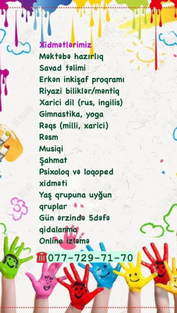 Övladlarınızın təhsil yolunda ilk dayanacağı olan uşaq bağçaları uşaqların bacarıqlarını inkişaf etdirən cəlbedici fəaliyyətləri özündə cəmləşdirən rəqabətsiz mühitdir. Uşaq bağçası onların təhsil həyatları üçün möhkəm zəmin yaradır. Bağça təkcə təhsil vermir, həm də övladınızın sosial və emosional inkişafına da dəstək olur.