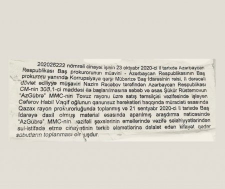 O, “AzGübrə” MMC-nin Tovuz rayonu üzrə satış müdiri Habil Cəfərovun və Ağstafa rayon Aqrolizinq idarəsinin rəhbər vəzifəli şəxsi Cavanşir Əmrahovun adını çəkərək, onların öz vəzifə səlahiyyətlərindən sui-istifadə etdiklərini bildirir.