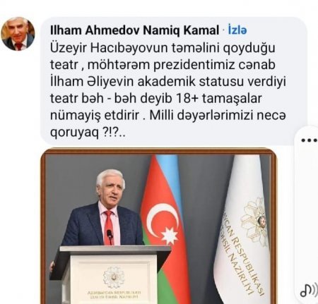 Sənətçi teatrda səhnələşdirilən "Qadınım" tamaşası ilə bağlı bu fikirləri qeyd edib: "Üzeyir Hacıbəyovun təməlini qoyduğu teatr, Möhtərəm Prezidentimiz İlham Əliyevin akademik statusu verdiyi teatr "bəh-bəh" deyib 18+ tamaşalar nümayiş etdirir. Milli dəyərlərimizi necə qoruyaq?!"//bakupost