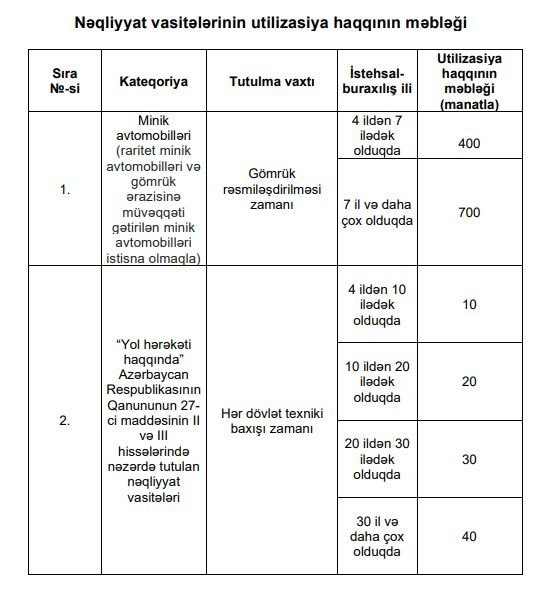 Nəqliyyat vasitələrinin utilizasiya haqqının məbləği, utilizasiyaya verilən nəqliyyat vasitəsi üçün tətbiq edilən güzəştin məbləği və birdəfəlik ödənişin həcmi təsdiqlənib.