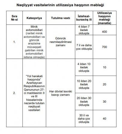 “Nəqliyyat vasitələrinin utilizasiya haqqının məbləği” 2024-cü il fevralın 1-dən, “Utilizasiyaya verilən nəqliyyat vasitəsi üçün tətbiq edilən güzəştin məbləği və birdəfəlik ödənişin həcmi” 2024-cü il sentyabrın 1-dən qüvvəyə minir.